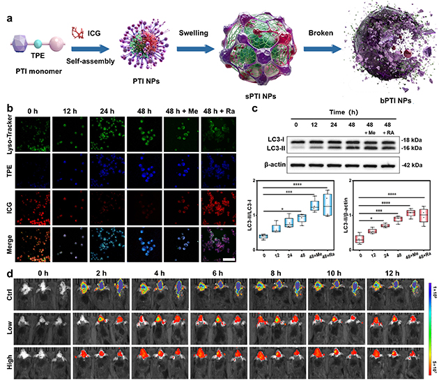 團隊進一步探索溶酶體功能變化與Aβ蛋白相分離之間的關(guān)系。通過ATRP合成pH響應(yīng)骨架,將AIE染料四苯乙烯(TPE)共價接枝,并自組裝包載近紅外ACQ染料吲哚菁綠(ICG),形成AIE/ACQ協(xié)同的比率成像納米結(jié)構(gòu)探針(PTI),實現(xiàn)AD自噬溶酶體酸化缺陷及其驅(qū)動的相分離過程的可視化“全流程”監(jiān)測。