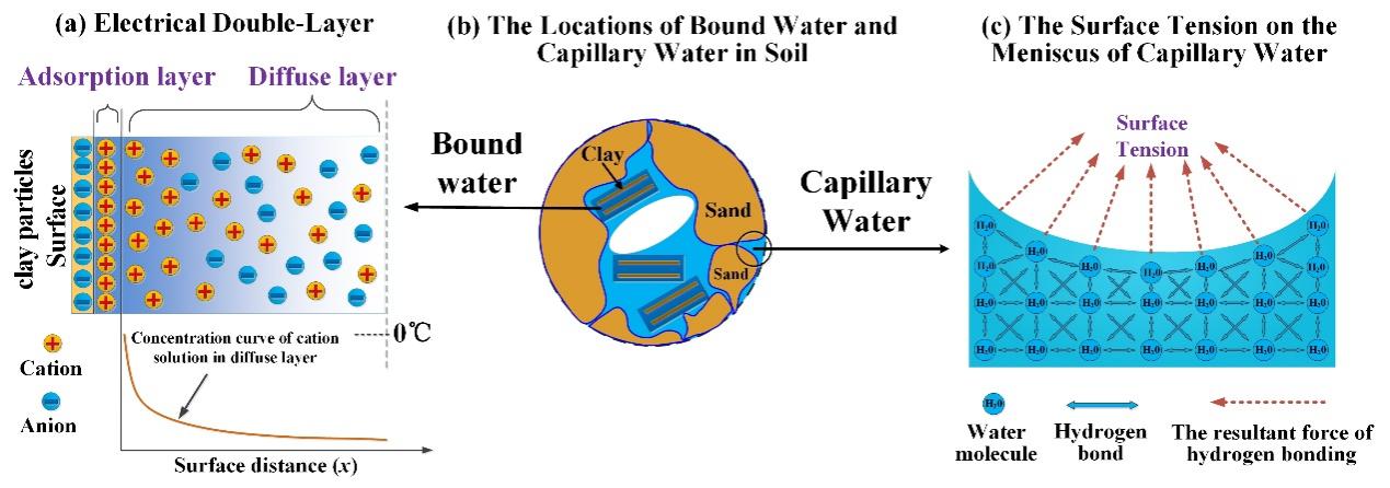 研究通過將電解質(zhì)溶液相變機制與雙電層理論相結(jié)合,構(gòu)建了凍土未凍水理論模型,定量刻畫了土壤鹽分(溶液濃度、溶質(zhì)種類及比例)、表面電荷密度、溫度以及土壤類型(比表面積)等因素對未凍水含量的影響,克服了傳統(tǒng)土水勢模型難以實現(xiàn)物理參數(shù)化的固有局限。