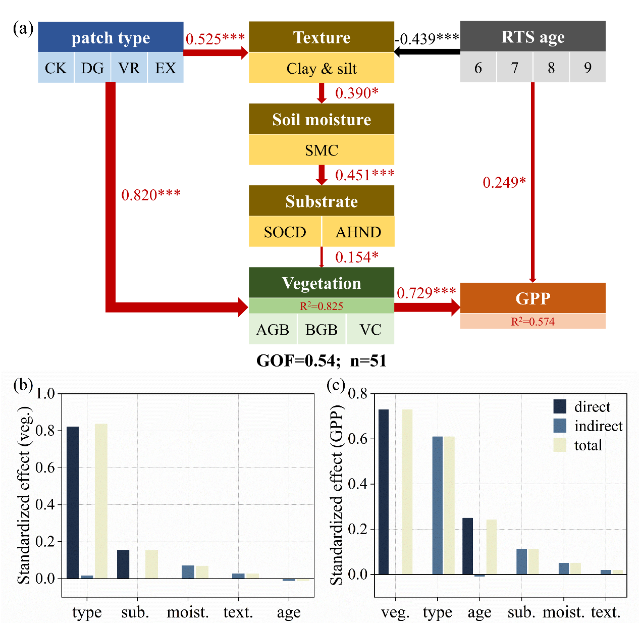 偏最小二乘路徑模型結(jié)果表明,熱融滑塌主要通過(guò)“土壤質(zhì)地-水分-基質(zhì)-植被-GPP”路徑影響青藏高原生態(tài)系統(tǒng)功能。其中植被對(duì)GPP的直接控制最強(qiáng),滑塌年齡次之,土壤過(guò)程則更多通過(guò)調(diào)節(jié)群落結(jié)構(gòu)間接作用影響GPP。因此,在評(píng)估熱喀斯特地貌的碳效應(yīng)時(shí),應(yīng)將滑塌地表類型及年齡組成納入考量。