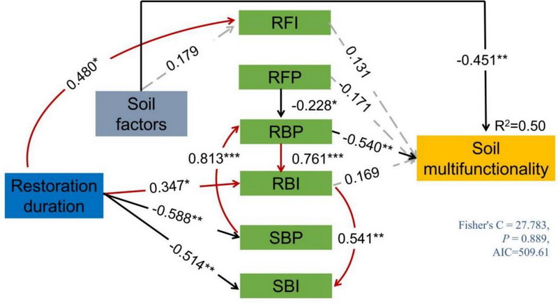中國科學(xué)院西北高原生物研究所高寒濕地生態(tài)系統(tǒng)近自然修復(fù)與功能提升研究團隊研究基于不同恢復(fù)年限(0-50年)的檸條人工林,揭示了土壤和根際微生物群落對土壤多功能性的驅(qū)動機制。結(jié)果顯示,隨著恢復(fù)年限增加,尤其恢復(fù)至35年與50年時,土壤多功能性顯著提升;細菌OTU豐富度與土壤多功能性呈顯著正相關(guān),而多樣性如Shannon和Pielou指數(shù)表現(xiàn)出負相關(guān);真菌豐富度(OTU、Chao1)均與多功能性強正相關(guān)。結(jié)構(gòu)方程模型表明,土壤因子對多功能性具有直接負向影響,根際細菌群落組成的變化是重要間接調(diào)節(jié)路徑。類似地,在三江源地區(qū)高寒草地中,由于近21%的草地已出現(xiàn)輕度退化,若缺乏修復(fù)措施,極可能在氣候變化與放牧壓力下進一步演變?yōu)椤昂谕翞薄T谶@一背景下,氮素添加作為最常見的草地修復(fù)措施,能夠在短期內(nèi)緩解氮限制、提高生產(chǎn)力。然而,隨著氮素添加持續(xù)時間的增加,草地生態(tài)系統(tǒng)往往出現(xiàn)土壤酸化、植物多樣性下降等負面效應(yīng)。結(jié)果表明,氮素添加的生態(tài)效應(yīng)取決于持續(xù)時間,以及氮素水平和類型;長期添加氮素會通過促進禾本科植物生長并抑制非優(yōu)勢物種的生長,從而降低物種多樣性;氮添加通過物種更替改變生物多樣性和多功能性關(guān)系。這些發(fā)現(xiàn)強調(diào)了在脆弱生態(tài)系統(tǒng)管理中,應(yīng)關(guān)注演替進程與外源干擾對群落組成和功能維持的雙重影響,從而為制定更精細化、長期有效的生態(tài)修復(fù)和可持續(xù)管理策略提供科學(xué)依據(jù)。