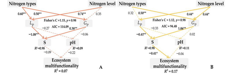 圖2 分段式結(jié)構(gòu)方程模型展示了各變量對生態(tài)系統(tǒng)多功能性的影響(A 長期氮添加,B 短期氮添加)