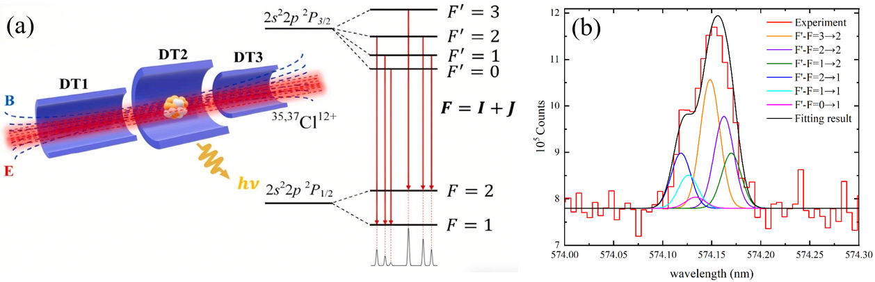 圖1. (a) SH-HtscEBIT中Cl12+離子的束縛態(tài)和發(fā)射態(tài)的能級(jí)圖,包括1??22??22??2P價(jià)態(tài)的超精細(xì)結(jié)構(gòu)。超精細(xì)能級(jí)用總角動(dòng)量F=I+J標(biāo)記,核自旋??= 3∕2; (b) 類(lèi)硼Cl12+離子的發(fā)射光譜,顯示基態(tài)1s22s22p 2P精細(xì)結(jié)構(gòu)能級(jí)間的M1躍遷(含超精細(xì)結(jié)構(gòu))。黑色實(shí)線為擬合結(jié)果,彩色實(shí)線和虛線分別代表35Cl和37Cl的超精細(xì)結(jié)構(gòu)譜線。