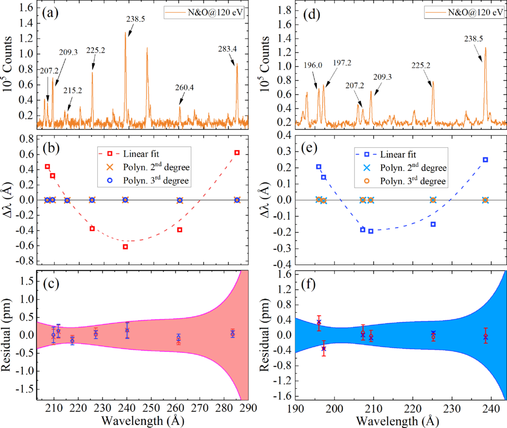 圖2. (a, d)分別為類(lèi)鈹 S12+和Cl13+離子的??坦庾V;(b, d)分別為S12+和Cl13+離子的離子色散函數(shù)的殘差圖;(c, f) 為殘差放大圖和1-σ置信區(qū)間;