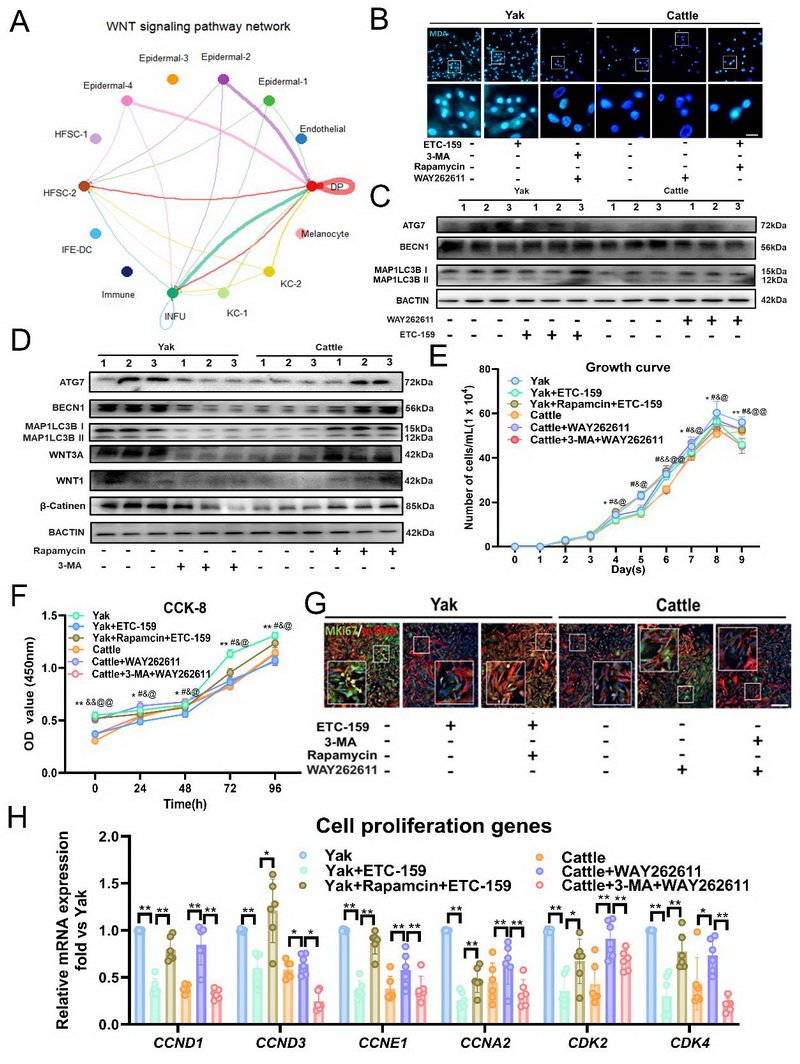 文章代表圖:DP細胞中自噬與增殖的相互作用由WNT/β-Catenin通路介導(dǎo)。(A)DP細胞單細胞數(shù)據(jù)中WNT信號通路的細胞相互作用圖。(B)不同處理后牦牛和普通牛DP細胞的MDA活細胞染色。(C)牦牛、牦牛+ETC-159、普通牛和普通牛+WAY262611處理組DP細胞中ATG7、BECN1和LC3I/II的蛋白質(zhì)印跡分析(n=3)。(D) 牦牛、牦牛+3-MA、普通牛和普通牛+雷帕霉素處理組DP 細胞中ATG7、BECN1、LC3I/II、WNT3A、WNT1和β-Catenin的蛋白質(zhì)印跡分析(n=3)。(E-F)牦牛、牦牛+ETC-159、牦牛+雷帕霉素+ETC-159、普通牛、普通牛+WAY262611和普通牛+3-MA+WAY262611組DP細胞的生長曲線(n=9)和CCK-8檢測結(jié)果(n=4)。(G)不同處理組牦牛和普通牛DP細胞體外培養(yǎng)后PCNA和MKi67的代表性免疫熒光圖像(n=8)。(H)實時熒光定量PCR檢測細胞增殖相關(guān)基因CCND1、CCND3、CCNE1、CCNA2、CDK2CDK4的mRNA表達情況(n=6)