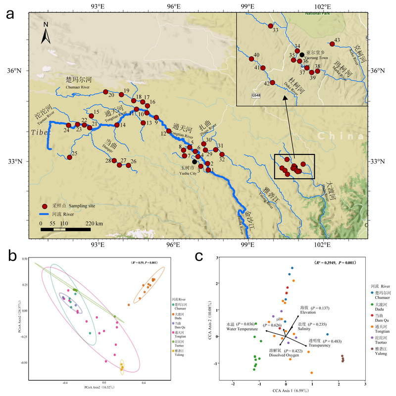 a 青藏高原長(zhǎng)江源區(qū)調(diào)查采樣點(diǎn)示意圖;b 長(zhǎng)江源區(qū)各水系魚(yú)類(lèi)群落主坐標(biāo)分析圖;c 長(zhǎng)江源區(qū)各水系魚(yú)類(lèi)群落典范對(duì)應(yīng)分析圖