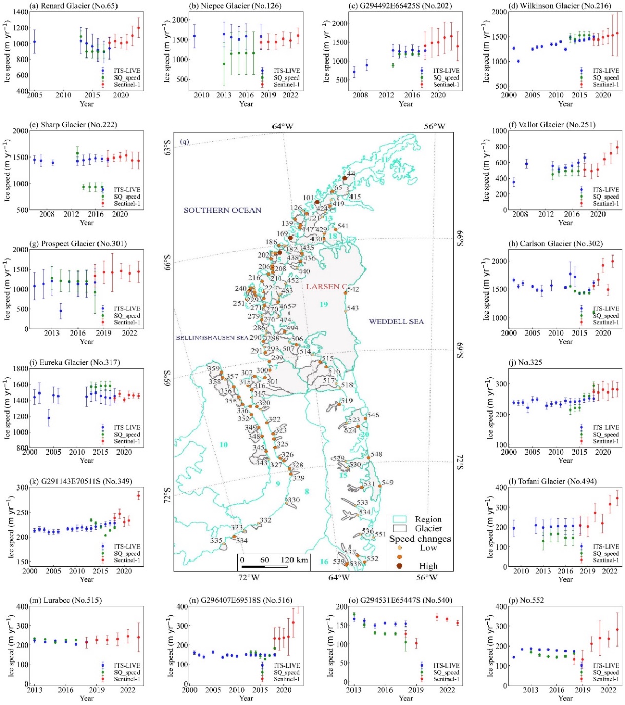 中國科學(xué)院西北生態(tài)環(huán)境資源研究院冰凍圈科學(xué)與凍土工程全國重點實驗室康世昌研究員團(tuán)隊,通過2018–2023年Sentinel-1 SAR影像反演獲得6181組有效冰川流速數(shù)據(jù),系統(tǒng)揭示了南極半島冰川流速的時空變化特征及空間差異規(guī)律。