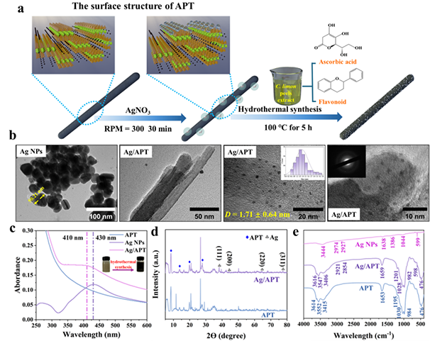 研究人員采用檸檬皮提取物介導(dǎo)的低溫水熱法,利用所含抗壞血酸與多酚類物質(zhì)將Ag+還原為Ag0,并原位均勻錨定于凹凸棒石納米棒晶表面,構(gòu)筑了銀納米粒子尺寸小于2 nm的Ag/凹凸棒石復(fù)合納米酶(Ag/APT)(圖1)。該礦物復(fù)合納米酶比AgNPs具有更大的比表面積和更多的活性位點(diǎn)。對多重耐藥菌性耐甲氧西林金黃色葡萄球菌(MRSA)和產(chǎn)超廣譜β-內(nèi)酰胺酶大腸桿菌(ESBLs-E.coli)均表現(xiàn)出優(yōu)異的廣譜抗菌活性。
