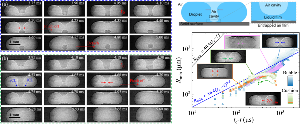固液界面相互作用涉及典型的多尺度界面現(xiàn)象與流動(dòng)過程,液滴撞擊固體表面時(shí)會(huì)沿中心軸產(chǎn)生圓柱形氣腔,并在液滴下方捕獲一層空氣薄膜。傳統(tǒng)觀點(diǎn)認(rèn)為這層氣膜在影響撞擊結(jié)果中起關(guān)鍵作用。之前的研究僅發(fā)現(xiàn)慣性主導(dǎo)的軸向內(nèi)爆導(dǎo)致氣腔夾斷并演化為氣泡,而對不形成氣泡的情況并不清楚,對氣腔與氣膜的相互作用也不了解。由于動(dòng)態(tài)液滴中存在多個(gè)液氣界面和復(fù)雜的構(gòu)型變化,傳統(tǒng)光學(xué)成像方法無法深入解析多界面動(dòng)力學(xué)。