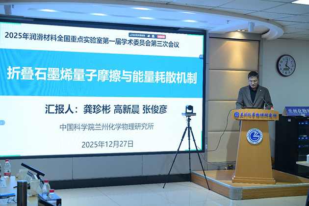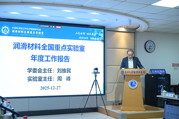 蘭州化物所所長(zhǎng)、實(shí)驗(yàn)室主任周峰研究員作了2025年度工作報(bào)告,全面梳理科研成果、平臺(tái)建設(shè)、人才引育、產(chǎn)業(yè)化等領(lǐng)域的成效,深入剖析現(xiàn)存問(wèn)題與改進(jìn)思路,明確2026年工作重點(diǎn)與核心發(fā)展目標(biāo)。蔡美榮研究員、鮑路瑤副研究員、龔珍彬副研究員分別作了“固/介質(zhì)復(fù)合潤(rùn)滑材料的空間環(huán)境效應(yīng)及在軌驗(yàn)證研究”“潤(rùn)滑油材料的高通量計(jì)算和人工智能設(shè)計(jì)”“折疊石墨烯量子摩擦與能量耗散機(jī)制”的學(xué)術(shù)報(bào)告。