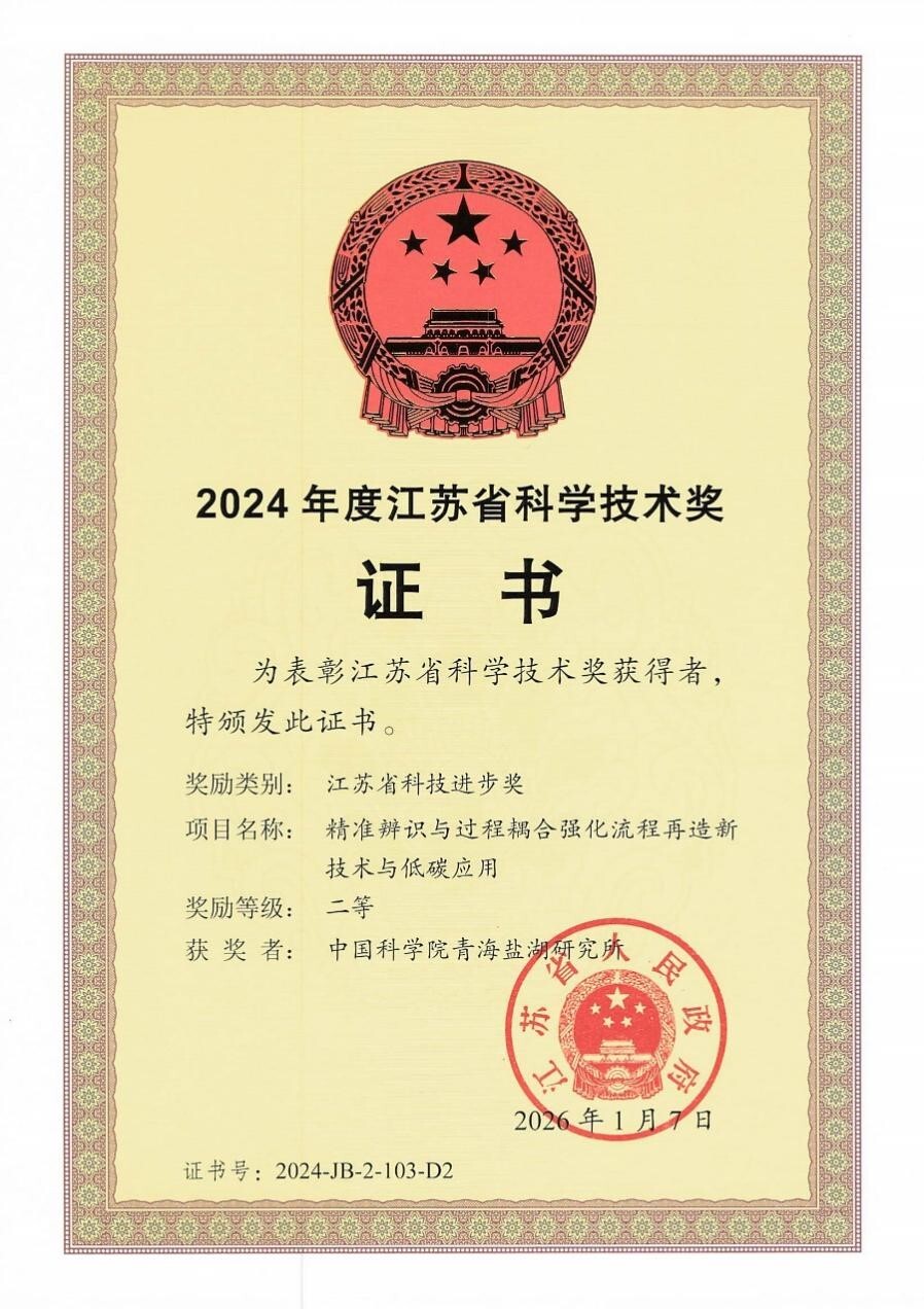 近日,江蘇省人民政府發(fā)布《關(guān)于2024年度江蘇省科學(xué)技術(shù)獎勵的決定》(蘇政發(fā)〔2026〕2號),由中國科學(xué)院青海鹽湖研究所作為第二完成單位參與完成的“精準(zhǔn)辨識與過程耦合強(qiáng)化流程再造新技術(shù)與低碳應(yīng)用”項目,榮獲2024年度江蘇省科技進(jìn)步二等獎。