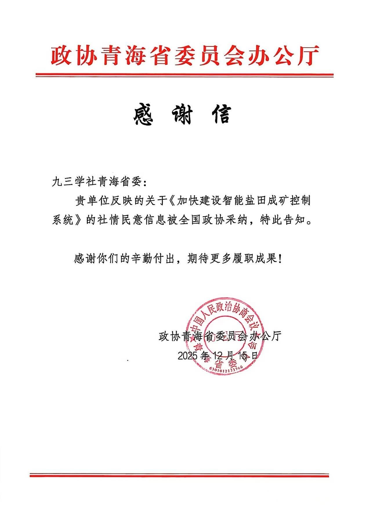 九三學(xué)社青海鹽湖所委員會建言獻(xiàn)策獲全國政協(xié)采納