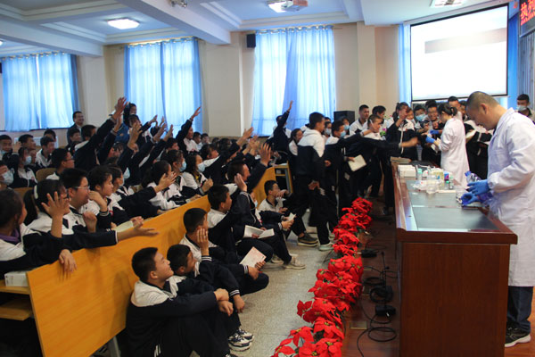 在校園,青海鹽湖所的博士科普?qǐng)F(tuán)隊(duì)為中學(xué)生們講述了鹽湖故事,在《中國(guó)的鹽湖》科普講座中,形象生動(dòng)地講述了“什么是鹽湖”“鹽湖在哪里”“鹽湖里有什么用”,使同學(xué)們對(duì)青海的特色優(yōu)勢(shì)鹽湖資源有了初步的認(rèn)識(shí);開(kāi)展了神奇的化學(xué)小實(shí)驗(yàn),通過(guò)多彩化學(xué)、密碼顯形、黃金雨、催化放氧、銅樹(shù)銀枝、銀鏡反應(yīng)等一系列精彩的科普實(shí)驗(yàn),緊緊抓住“變化”這一核心,以極具震撼力的方式向同學(xué)們展示了化學(xué)之美和科學(xué)之美,為同學(xué)們開(kāi)啟科學(xué)世界的大門(mén),激起他們探索科學(xué)世界的興趣;醫(yī)療專(zhuān)家為同學(xué)們現(xiàn)場(chǎng)普及家庭急救知識(shí)和新冠疫情預(yù)防知識(shí),現(xiàn)場(chǎng)演示了心肺復(fù)蘇方法、正確的洗手方法及注意事項(xiàng)。無(wú)論是小實(shí)驗(yàn)還是急救現(xiàn)場(chǎng)演示,同學(xué)們踴躍主動(dòng),興致勃勃,教室里不時(shí)發(fā)出陣陣驚嘆聲和掌聲,活動(dòng)取得了圓滿成功。