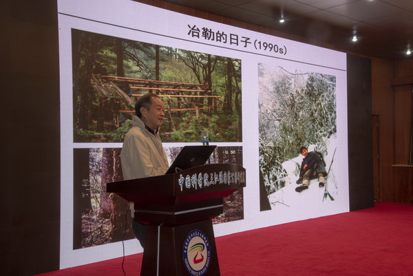 魏輔文院士以他的學術(shù)生涯為主線,講述了其自20世紀80年代開始從事大熊貓的研究工作,從最初的大熊貓野外調(diào)查、觀察,到率先將種群基因組學、宏基因組學、比較基因組學等新技術(shù)應(yīng)用到大熊貓研究中,闡明了大熊貓的種群歷史、瀕危過程及演化潛力,揭示了大熊貓在食性轉(zhuǎn)換和特化歷程中如何在形態(tài)、行為、生理、遺傳和腸道微生物等方面產(chǎn)生適應(yīng)性演化的規(guī)律;闡明了棲息地破碎化導致大熊貓孤立小種群崩潰的機制,推動了國家大熊貓放歸和棲息地廊道建設(shè)工程的實施。魏輔文首次提出“保護演化生物學”和“保護宏基因組學”新分支學科,并介紹了穩(wěn)定同位素分析技術(shù)和營養(yǎng)幾何模型分析等新技術(shù)和新方法。魏院士結(jié)合自己30多年在保護生物學領(lǐng)域的經(jīng)歷,鼓勵大家在科學道路上堅持思考,不斷探索,勇于創(chuàng)新。此次報告大大開拓了與會人員的學術(shù)視野,鼓舞了廣大科技人員的科研熱情。