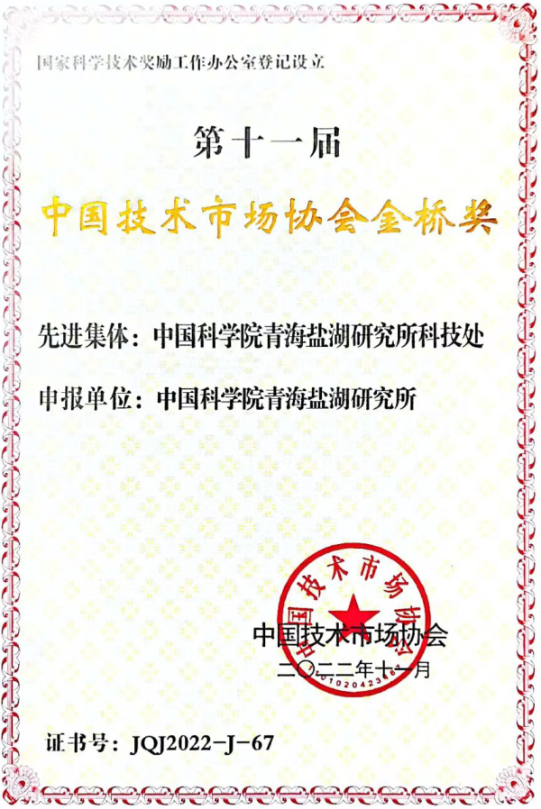 青海鹽湖所獲第十一屆中國技術(shù)市場協(xié)會金橋獎獎勵大會表彰