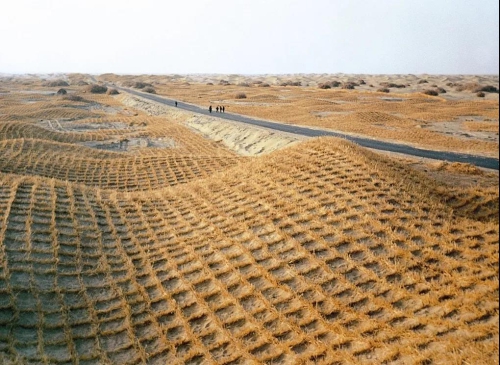 實際上,草方格最早應(yīng)用于我國第一條沙漠鐵路包蘭鐵路的建設(shè)中。在寧夏沙坡頭地區(qū)火車穿越了騰格里沙漠,在科技工作者和當(dāng)?shù)厝罕姷墓餐ο?,麥草方格編成的巨網(wǎng)最終成功縛住了“沙龍”。沙坡頭因此被稱為“草方格的故鄉(xiāng)”。如今,一把鐵鍬,一捆麥草,一片草方格,沙坡頭實現(xiàn)了黃沙變綠洲的嬗變,騰格里沙漠中神奇地出現(xiàn)了一條連綿延伸的“綠帶”。